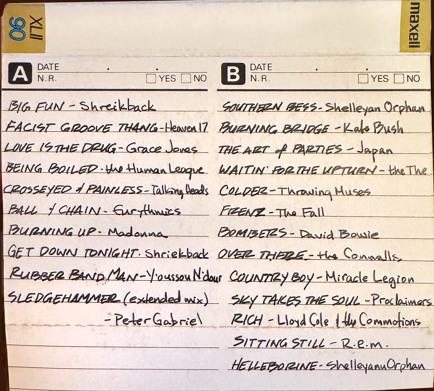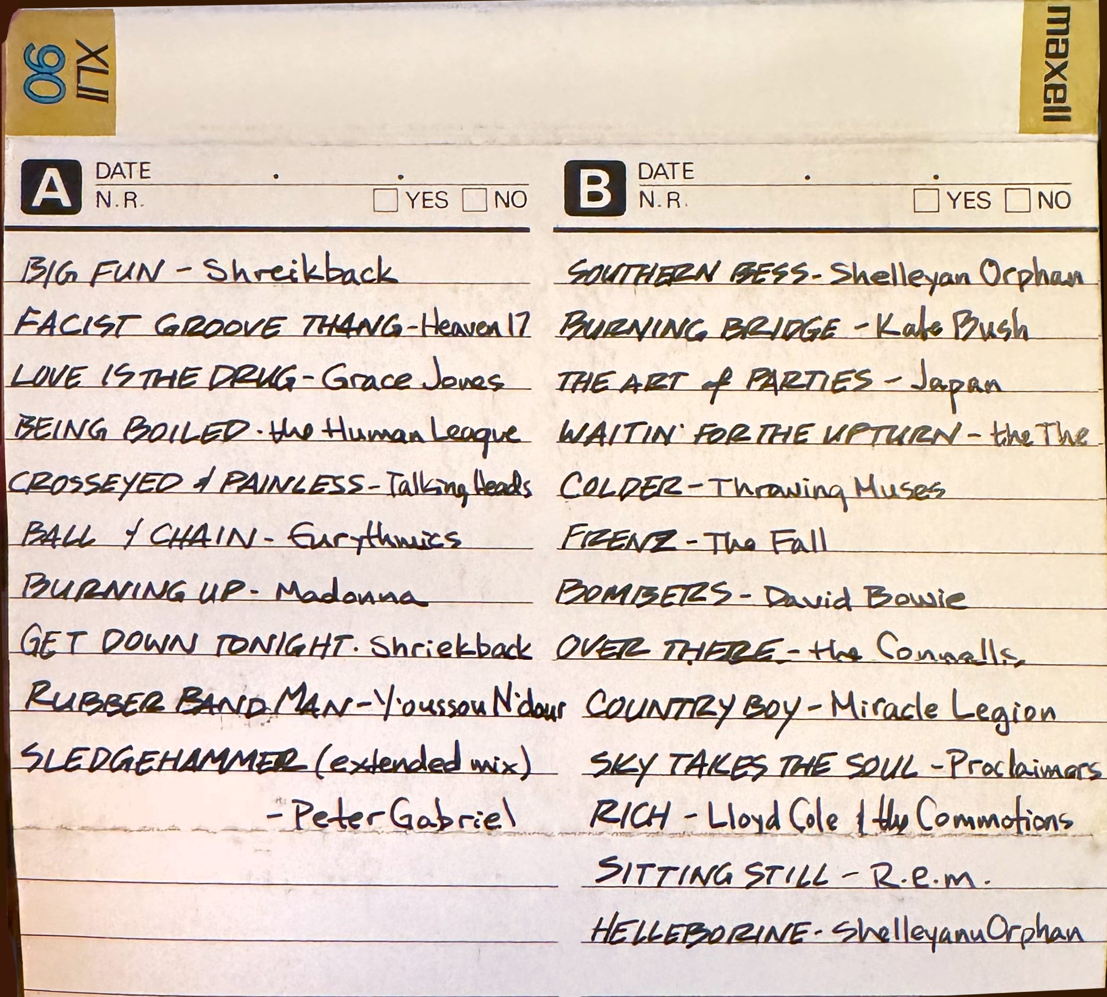 Oof, why did I put this song on the tape? Not that it’s bad, quite the opposite. I usually reserve the most devastating songs for the listener to discover on their own, if that makes sense. Maybe I was going along with the theme of boys not being ready, whether it’s to go to war or something else. I met Mark Mulcahy at a gig in Cincinnati when I was in grad school. Miracle Legion opened for Camper van Beethoven, who I had no interest in. I saw Mark standing by the bar after their set, and we ditched the club and went to my favorite out-of-the-way coffeehouse down the street. Years later, but before YouTube, et al, I paid $50 for the Japanese CD release of this album because I had no other way to listen to it. Formative, for sure.